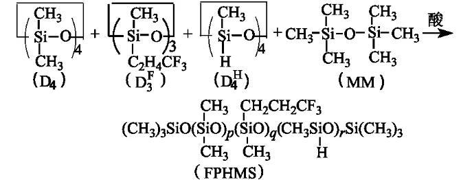 在裝有攪拌器、溫度計、回流冷凝管的四口燒瓶中,按n(D4)∶n(D3F)∶n(D4H)∶n(MM)=1∶1∶1∶1比例依次加入D4、D3F、D4H、MM,攪拌下加熱升溫至50——60℃,緩慢加入濃H2SO4(占單體總的質(zhì)量分數(shù)3%),控溫在50——60℃反應(yīng)4 h.后升溫至80——90℃,加適量Na2CO3,反應(yīng)數(shù)小時,使體系pH近5——6,冷卻,靜置,抽濾,得無色透明液體,即中間體含氟含氫聚硅氧烷(FPHMS),其含Si-H基的氫質(zhì)量分數(shù)為0.343%.反應(yīng)式為: