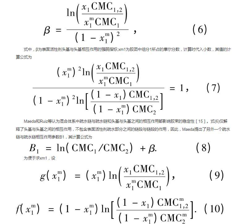 式中,β為表面活性劑頭基與頭基相互作用的強弱指標;xm1為膠團中組分1所占的摩爾分數(shù),計算時代入小數(shù),其值的計算公式為