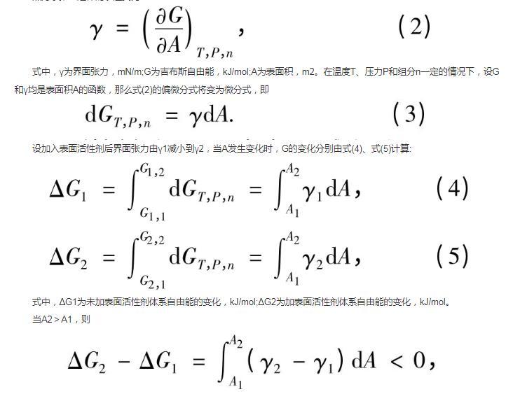 式中,γ為界面張力,mN/m;G為吉布斯自由能,kJ/mol;A為表面積,m2。在溫度T、壓力P和組分n一定的情況下,設(shè)G和γ均是表面積A的函數(shù),那么式(2)的偏微分式將變?yōu)槲⒎质剑?