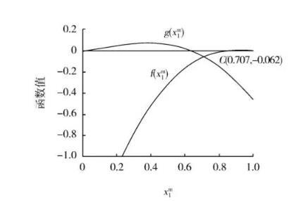 圖2 g(x m1)和f(x m1)關(guān)于x m 1的曲線