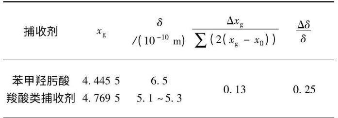 由表4可知,733與苯甲羥肟酸組合藥劑的浮選效果好于油酸與苯甲羥肟酸的組合藥劑。下面以這兩種藥劑為例,討論基團電負性和極性基斷面尺寸與協(xié)同效應的關(guān)系。藥劑基團電負性和極性基斷面尺寸都影響藥劑選擇性,經(jīng)推導,兩種捕收劑的參數(shù)若滿足,則極性基斷面尺寸是藥劑選擇性的主要影響因素,其中,Δxg為基團電負性的差值,取正值;xg為基團電負性值,計算時代入兩者中的較大值;x0為氧的負電性;δ為極性基斷面尺寸,10-10m;Δδ為極性基斷面尺寸的差值,取正值。