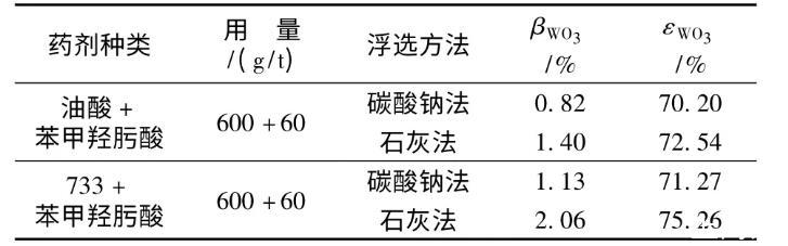 羧酸類捕收劑與苯甲羥肟酸是兩類典型的氧化礦浮選組合藥劑,兩者都可用于白鎢礦浮選,兩類藥劑的浮選試驗結(jié)果如表4所示。