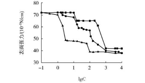 對于在水中溶解度較低的捕收劑,如油酸或低溫下的油酸鈉,加入表面活性劑后,油-水界面張力降低,有助于油酸藥效的發(fā)揮。油-水界面張力難以測定,但可用溶液的表面張力來衡量,油酸鈉溶液及加入表面活性劑后的油酸鈉溶液的表面張力與油酸鈉濃度C的關(guān)系見圖1。