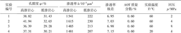 主要實驗材料:選用2-(2-乙基己基)-磺酸琥珀酸鈉(AOT)為表面活性劑;實驗用CO2純度為99.9%;實驗用水為蒸餾水;實驗巖心為填砂管模型,規格參數:600 mm×Φ25 mm。表1、2所給出的回壓值即為巖心中流體所處的最低壓力,只有高于該回壓值,流體才可以流動。