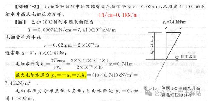 來自《土力學》式中,水膜張力T與溫度有關,單位:N/cm或KN/m;10°時,T=7.41×10-4N/cm=7.41×10-5KN/m;方向與毛細管成夾角α,該角度的大小與土顆粒礦物成分和水性質有關;