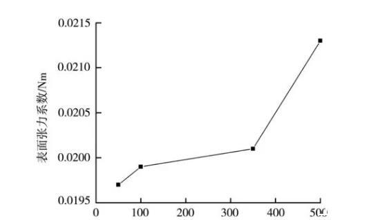 根據照片得到懸停液滴的形狀因子S分別為:(a)0.746;(b)0.757;(c)0.778;(d)0.789,由式(3)計算得到硅油樣品的表面張力系數分別為:(a)0.019 7 N/m;(b)0.019 9 N/m;(c)0.020 1 N/m;(d)0.021 3 N/m。與線性結構甲基硅油的表面張力系數(50 mm2/s的硅油為0.020 5 N/m,350 mm2/s的硅油為0.021 1 N/m[14])相比較,測量的相對誤差分別為3.9%、4.7%,接近懸滴法測量液體表面張力系數所能達到的最大精度(相對誤差為2%~3%)[13]。根據測量結果,得到硅油表面張力系數隨其黏滯系數的變化關系,如圖5所示。可見硅油表面張力系數隨著黏度系數的增加稍稍增大,硅油黏滯性對其表面張力稍有影響。這種影響與液體內部分子之間的相互作用有關。隨著液體黏滯性增加,液體的流動性變差,液體表面對液體分子的約束作用增強,導致其表面張力增大。