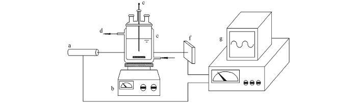 a. Laser generator; b. magnetic stirrer; c. jacketed reactor; d. circulating water; e. thermometer; f. laser detector; g. data acquisition.
