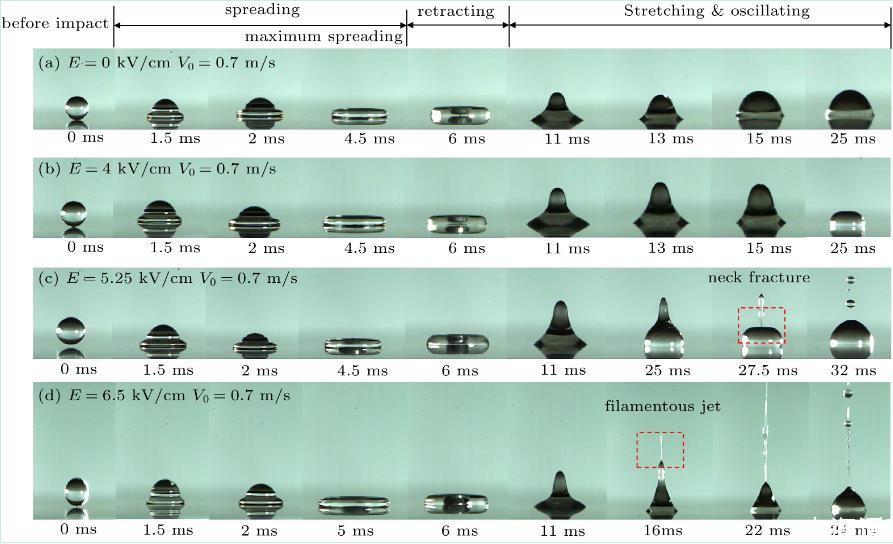 圖2去離子水在不同場強下撞擊親水表面的模態變化圖(We=17.8)