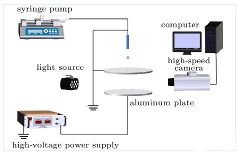 在本實驗中,將兩塊直徑為10cm的圓形鋁板沿著垂直方向放置,其間隔固定為20mm。在上極板中心位置開一個直徑為5mm的孔口,以便液滴從上極板上方滴落,穿過上極板與下極板發生撞擊行為。為了實現垂直電場的形成,將高壓直流電源與下極板相連,上極板作接地處理,這樣的結構產生了一個垂直電場和一個帶電的基底。此外,不銹鋼針管(G24,外徑0.55m,內徑0.27mm)通過毛細管連接到微流注射泵上,使液滴以恒定的撞擊速度滴落到下極板。為了消除靜電對實驗的影響,將針管作接地處理,確保液滴在進入電場之前不攜帶任何感應電荷。