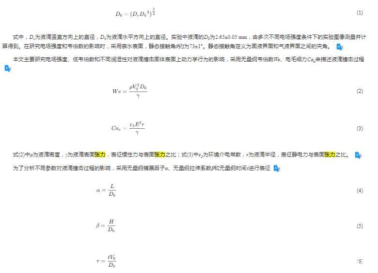 本文主要研究電場強度、低韋伯數和不同潤濕性對液滴撞擊固體表面上動力學行為的影響,采用無量綱韋伯數We、電毛細力Cae來描述液滴撞擊過程