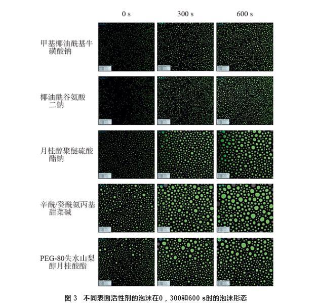 圖3不同表面活性劑的泡沫在0,300和600 s時的泡沫形態