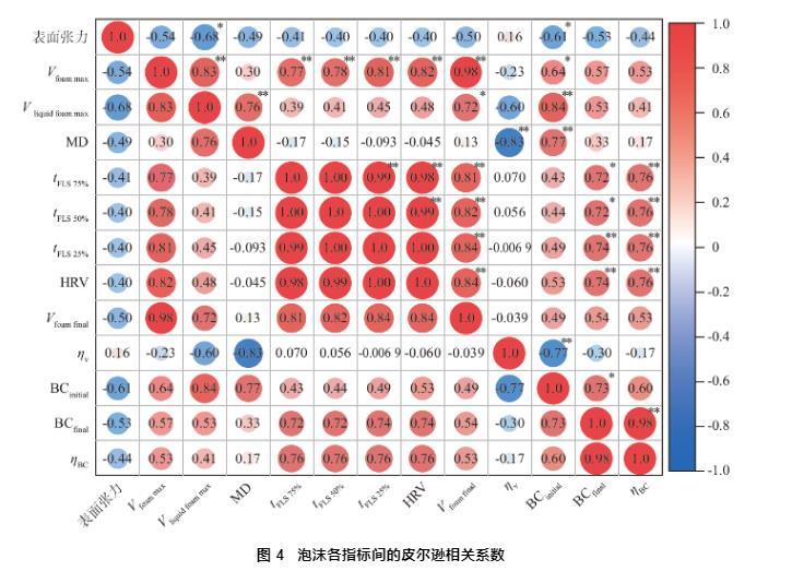 使用皮爾遜相關系數來闡明10種表面活性劑泡沫各指標間的相互關系,如圖4所示。
