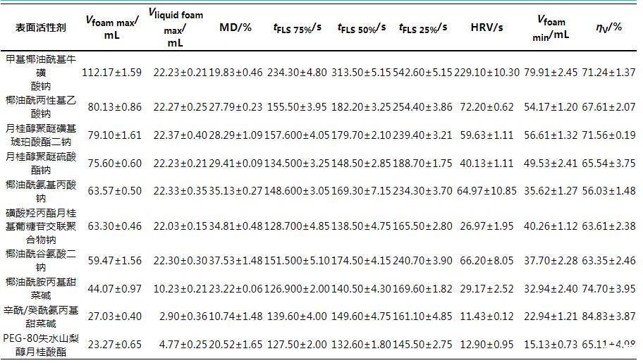 表4不同表面活性劑的泡沫體積、體積保留率、含液量等指標結果