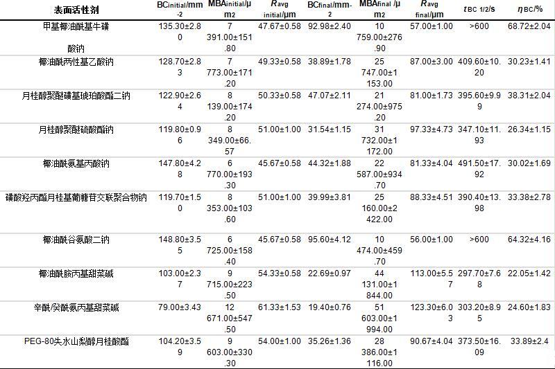 本研究除了測試表面活性劑溶液的表面張力、泡沫形態、泡沫密度保留率(ηBC)和泡沫體積保留率(ηV)外,還測試了最大泡沫含液量(Vliquid foam max)、析液半衰期(tFLS 50%)、氣泡個數半衰期(tBC1/2)、泡沫液體體積比率(MD)等指標,結果如表4和表5所示。
