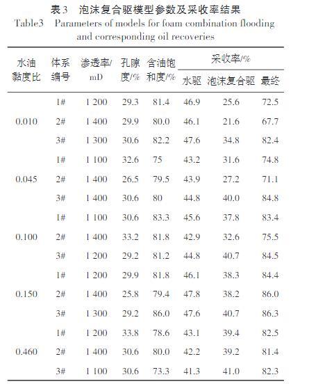因此,在該水油黏度比下,乳化對稠油泡沫復(fù)合驅(qū)具有較明顯的貢獻(xiàn)。②當(dāng)水油黏度比大于等于該界限,分別為0.150和0.460時(shí),1#,2#和3#泡沫復(fù)合體系驅(qū)油采收率增幅分別為38.3%,38.2%,40.7%和39.4%,39.2%,41.0%,3種泡沫復(fù)合體系驅(qū)油效果相差較小,乳化的貢獻(xiàn)較小,泡沫復(fù)合體系設(shè)計(jì)中不應(yīng)過分強(qiáng)調(diào)乳化性能。此外,對比復(fù)合驅(qū)(表2,圖5)和泡沫復(fù)合驅(qū)(表3,圖6)可見:①泡沫的引入確實(shí)能夠顯著提高稠油采收率,以水油黏度比0.010為例,1#,2#,3#復(fù)合體系驅(qū)油采收率增幅分別為15.9%,17.1%,20.6%,而泡沫復(fù)合體系分別為25.6%,21.6%,34.8%,顯著高于前者,相差幅度為9.7%,4.5%,14.2%,這說明泡沫復(fù)合驅(qū)在稠油驅(qū)替方面極具潛力。②與單一復(fù)合體系相比,泡沫復(fù)合體系驅(qū)替稠油對體系乳化性能的要求降低,能夠?qū)⑷榛阅芤蟮慕缦迯乃宛ざ缺葹?.200減小至0.150。