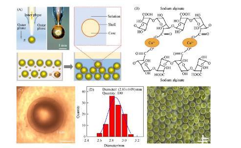 為了實現(xiàn)一步法制備大小均勻、尺寸可控、壁厚可調(diào)、生物相容的水/水微囊,需要設(shè)計同軸微流控器件,如圖1(A)所示。內(nèi)相黃原膠水溶液由內(nèi)管注入微流控器件;外相海藻酸鈉水溶液,由外管注入微流控器件。內(nèi)相在外相的剪切下形成液滴,同時外相在重力作用下脫離管口生成水包水的水/水微囊,并進(jìn)一步通過鈣離子交聯(lián)海藻酸鈉水凝膠網(wǎng)絡(luò),如圖1(B)所示。由于微流控器件對內(nèi)外相的精準(zhǔn)調(diào)控,水/水微囊在光學(xué)顯微鏡下具有清晰穩(wěn)定的核殼結(jié)構(gòu)圖1(C),平均尺寸(D)為(2.83±0.09)mm圖1(D)。該方法制備水/水微囊具有器件結(jié)構(gòu)簡單、操作便捷、一步法成型、微囊尺寸均一可控、核殼結(jié)構(gòu)穩(wěn)定、無需后處理等優(yōu)點(diǎn)圖1(E)。