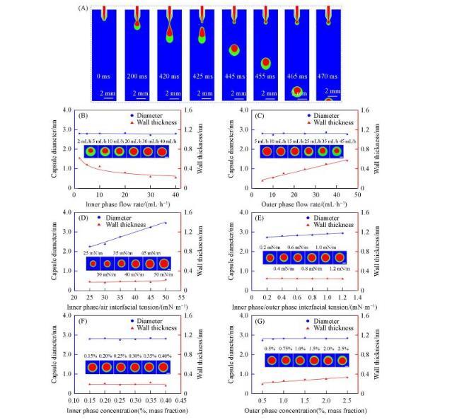 數(shù)值模擬與實驗結(jié)果具有較好的一致性,數(shù)值模擬內(nèi)相/外相流速對水/水微囊直徑和壁厚的影響,得出了與實驗數(shù)據(jù)一致的規(guī)律,即水/水微囊的直徑基本不隨內(nèi)相/外相流速的變化而變化,而水/水微囊壁厚隨內(nèi)相流速增加或外相流速減小都將減小,如圖4(B)和(C)所示。與實驗相比,數(shù)值模擬可以更系統(tǒng)地調(diào)節(jié)各個參數(shù),如外相/空氣界面張力、內(nèi)相/外相界面張力對微囊直徑和壁厚的影響。隨著外相/空氣界面張力的增加,水/水微囊直徑成比例增加,這是由于外相/空氣界面張力使微囊懸掛在管口,重力使微囊脫離管口,當(dāng)外相/空氣界面張力增加,需要的重力相應(yīng)增加,造成水/水微囊直徑增加。當(dāng)內(nèi)相/外相界面張力增大時,水/水微囊直徑略有增加。