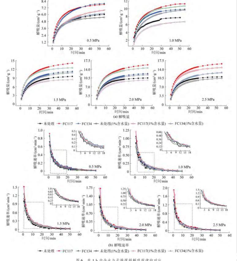 通過對干燥與含水煤樣解吸量和解吸速率的分析,經(jīng)過氣潤濕反轉(zhuǎn)劑——FC117和FC134處理后的煤樣解吸量和解吸速率均有所提升,其中FC117的效果更加顯著。同時,經(jīng)過表面活性劑處理后,煤樣的潤濕性發(fā)生轉(zhuǎn)變,水鎖效應(yīng)得到緩解和消除。含水煤樣的解吸量和解吸速率也均大于未處理的干燥煤樣。定量地分析了表面活性劑改變煤體表面潤濕性,由親水性向疏水性轉(zhuǎn)變,緩解水鎖損害,進而增加煤樣解吸量。