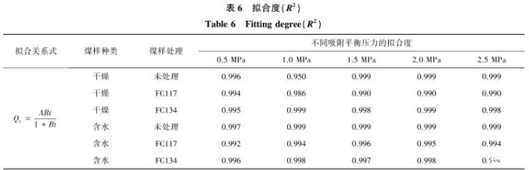 由表6可知,利用王佑安式擬合不同平衡壓力條件下的解吸量與時間關(guān)系曲線,得到曲線的擬合度。其中,氣潤濕反轉(zhuǎn)劑處理前后含水煤樣的擬合效果最好,擬合度均大于0.99。在干燥煤樣中,F(xiàn)C134處理后的煤樣擬合度最好,不同吸附平衡壓力條件下的擬合度均大于0.99;其次是未處理和FC117,擬合度也比較好,除去未處理煤樣中吸附平衡壓力為1.0 MPa,其余均在0.98以上。