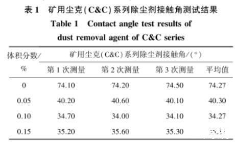 表1礦用塵克(C&C)系列除塵劑接觸角測(cè)試結(jié)果