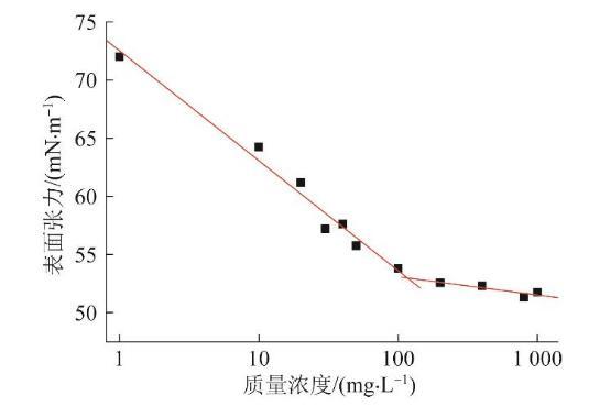 采用掛片法測量不同濃度h-PAMAM水溶液的表面張力(鉑片尺寸19.9 mm×10 mm×0.2 mm;精度0.01 mN/m)。不同濃度的h-PAMAM水溶液在室溫下的表面張力如圖2所示,由凝膠滲透色譜法(GPC)測得h-PAMAM的平均分子質(zhì)量為8 351 g/mol,并通過其計算了相關的熱力學參數(shù)。
