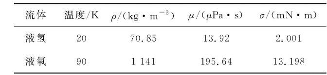 相較于常規(guī)推進劑,以液氫/液氧為代表的低溫推進劑具有高比沖、無毒、無污染等諸多優(yōu)勢,是目前以及未來很長一段時間內空間工程的首選推進劑。然而,低溫推進劑沸點低、汽化潛熱低等特殊物性,為其長期空間貯存和在軌管理技術帶來巨大挑戰(zhàn)。因此,對于低溫推進劑,采用表面張力式流體液體管理裝置是解決其空間應用難題的關鍵突破點?;谇拔牡拿毩鲃幽P停瑢σ簹洹⒁貉鮾煞N流體的內角流動情況進行計算分析。液氫和液氧的物理性質參數如表1所示。為了與空間貯箱中的應用一致,采用低溫流體在不銹鋼表面上的接觸角(近似為0°)。