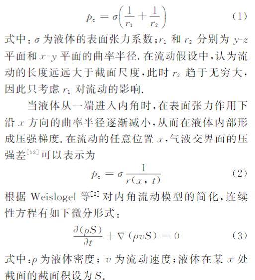 當液體從一端進入內角時,在表面張力作用下沿x方向的曲率半徑逐漸減小,從而在液體內部形成壓強梯度。在流動的任意位置x,氣液交界面的壓強差可以表示為
