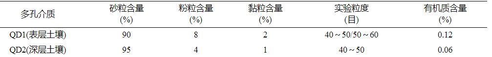 本研究選用的兩種多孔介質(zhì)分別為QD1(表層20~40cm土壤)和QD2(地下50~100cm深層土壤),均采自青島市嶗山區(qū)某農(nóng)田。經(jīng)過(guò)自然風(fēng)干后,將其篩分為40~50目和50~60目。實(shí)驗(yàn)選用土壤中的金屬氧化物含量均較低,主要差異為有機(jī)質(zhì)含量。土壤樣品的性質(zhì)見表1。