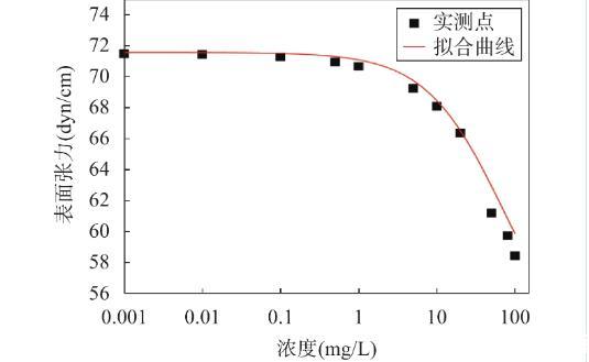 在0.01mol/L氯化鈉溶液中測(cè)量所得的6∶2氟調(diào)磺酸表面張力如圖1所示,圖中實(shí)心點(diǎn)表示同一濃度下表面張力的實(shí)際平均值,曲線(xiàn)是基于Szyszkowaki方程擬合所得。利用該方程擬合的相關(guān)參數(shù)A和B的值分別為12.70和0.075。實(shí)驗(yàn)結(jié)果顯示實(shí)測(cè)數(shù)據(jù)點(diǎn)與擬合曲線(xiàn)偏移量較小,這證實(shí)了Szyszkowaki方程對(duì)本實(shí)驗(yàn)體系的表面張力數(shù)據(jù)具有良好的擬合效果。
