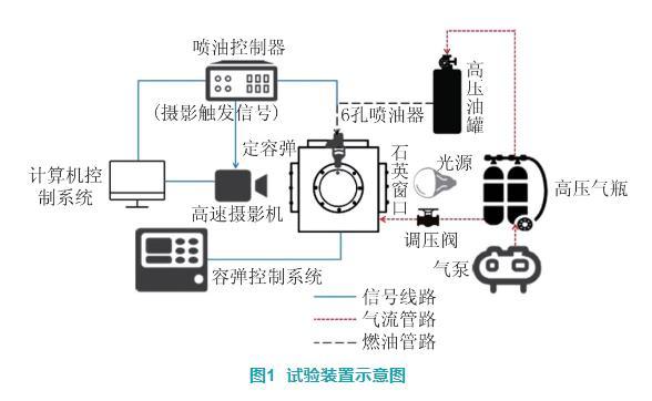 圖1為試驗裝置示意圖,主要由計算機控制系統、噴油系統控制器、高壓燃料供給系統、定容彈系統、高速攝像裝置等組成。