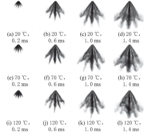 圖4不同環(huán)境溫度和噴霧開始后時(shí)刻下甲醇的噴霧形態(tài)