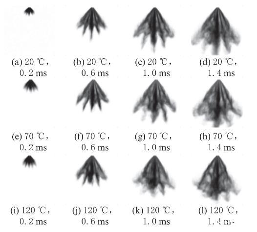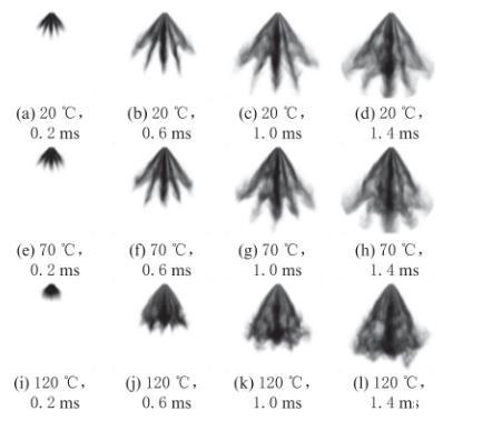 圖5不同環(huán)境溫度和噴霧開始后時(shí)刻下乙醇的噴霧形態(tài)