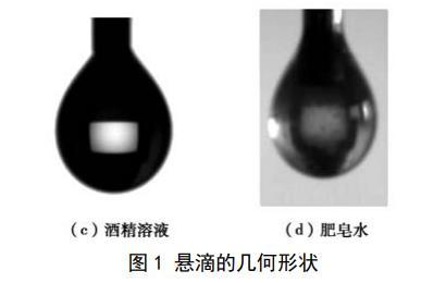 試驗(yàn)為比較3種液體表面張力的大小,采用懸滴法對(duì)液體的表面張力進(jìn)行測(cè)量,懸滴法的基本原理是:處于毛細(xì)管端液體懸滴的形狀與液體的表面張力有關(guān),在重力作用下,毛細(xì)管端形成的球形液滴的形變,隨著液滴有效密度的增加而增加并隨著液滴界面張力的增加而減小。通過Young–Laplace方程可以推導(dǎo)得到懸滴法計(jì)算表面張力的基本方程:
