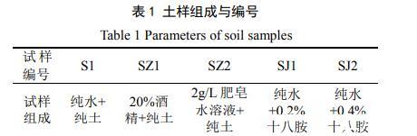 試驗(yàn)用土取自云南省境內(nèi)昆曲高速公路嚴(yán)家山段,為淺灰色弱膨脹土,其自由膨脹率為55.7%,液限為41%,塑限為20.3%。取回的土樣經(jīng)過風(fēng)干、碾碎后過2 mm的篩備用。為研究氣–液界面張力對(duì)膨脹土干縮開裂的影響,采用3種不同表面張力的液體作為土中的液相,分別為:純水、體積百分?jǐn)?shù)為20%的酒精溶液和含量為2 g/L的肥皂水;通過在土體中混合斥水劑的方法配制不同接觸角的土樣,斥水劑十八烷基伯胺(C18H39N),簡(jiǎn)稱:十八胺,為堿性白色蠟狀粉末,純度為99%,配制兩種斥水土樣,十八胺含量分別為:0.2%和0.4%。各土樣的成分和編號(hào)如表1所示。