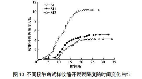 圖10不同接觸角試樣收縮開裂裂隙度隨時間變化曲線