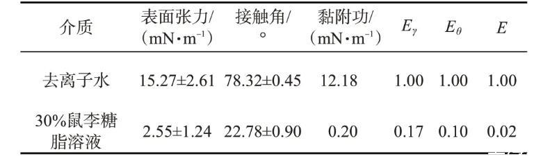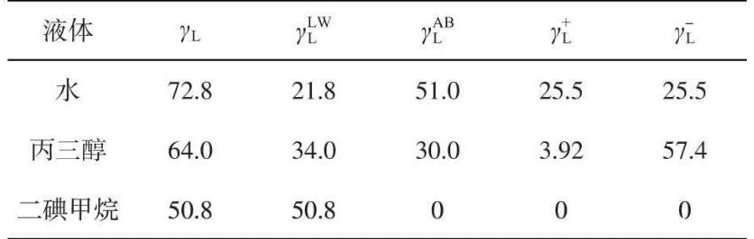 基于接觸角測量法中的LW-AB法,參考韓玉香等的研究,首先分別測試3種溶液(去離子水、丙三醇和二碘甲烷)在親油玻片及30%鼠李糖脂溶液處理后的親油表面的接觸角;然后結合3種溶液的表面張力及其分量值(表1),按照參考文獻中式1-38至式1-42,分別測算固體的表面能中Lifshits-van der waals分量、以及Lewis酸分量和堿分量;最后按照參考文獻中式1-37計算親油玻片及30%鼠李糖脂溶液處理后的親油表面自由能γS。