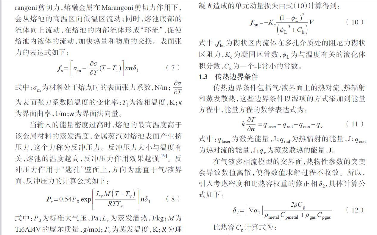 當輸入的能量密度過高時,熔池的最高溫度高于該金屬材料的蒸發溫度,金屬蒸汽對熔池表面產生擠壓力,這個力稱為反沖壓力。反沖壓力大小與溫度有關,熔池的溫度越高,反沖壓力作用效果越強。反沖壓力作用于“匙孔”壁面上,方向為垂直于氣/液界面,反沖壓力的計算公式如下: