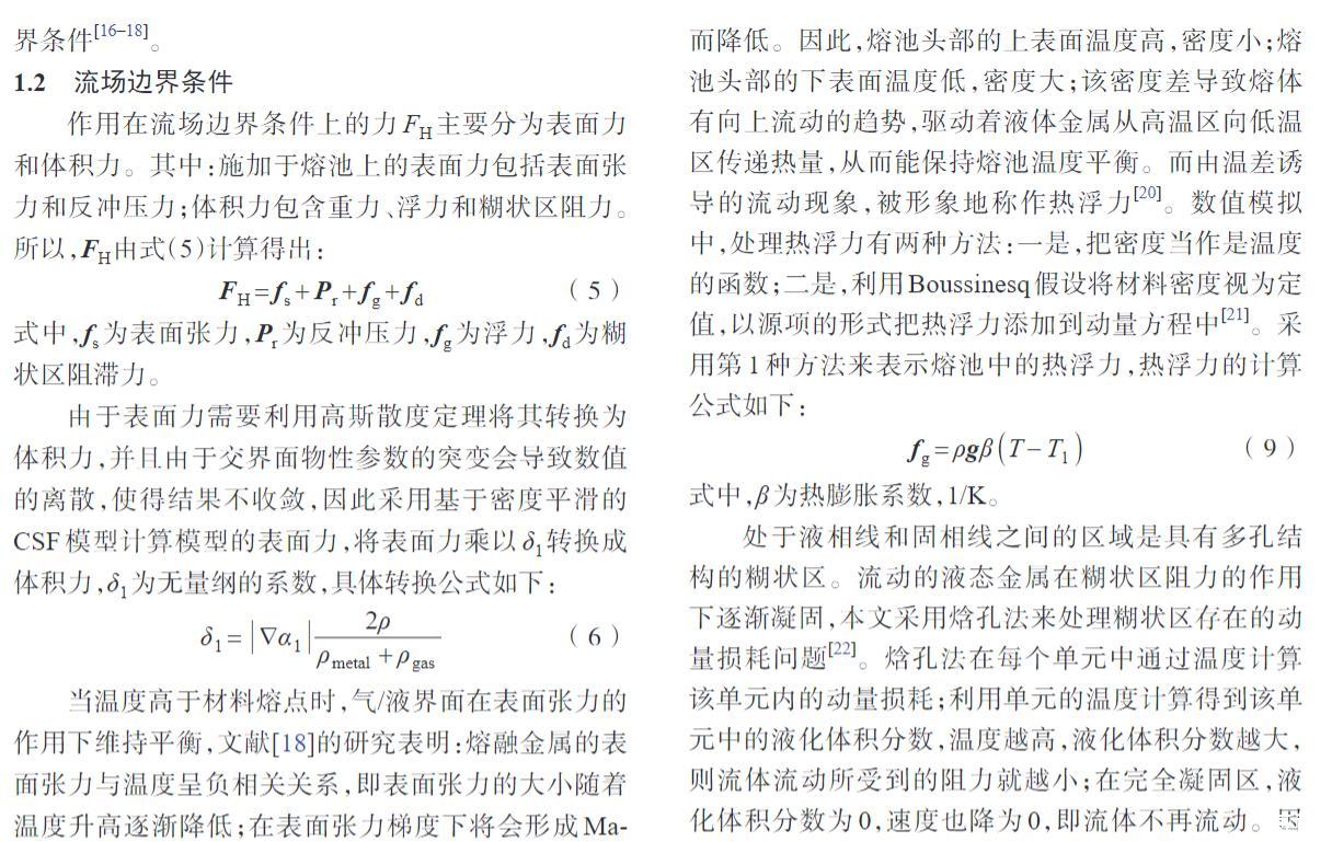 作用在流場邊界條件上的力FH主要分為表面力和體積力。其中:施加于熔池上的表面力包括表面張力和反沖壓力;體積力包含重力、浮力和糊狀區阻力。所以,FH由式(5)計算得出: