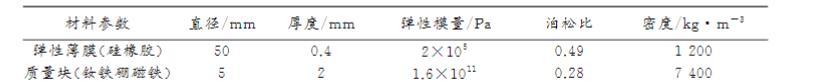 研究對(duì)象MAMs結(jié)構(gòu):彈性薄膜中心兩面粘結(jié)圓形質(zhì)量塊。薄膜采用硅橡膠,通過(guò)勻膠機(jī)制備:按硅膠與固化劑100:3比例混合,低速檔(500 rpm,30s)甩開(kāi)膠液,高速檔(1000 rpm,30s)均勻涂布于硫酸紙基底,靜置30min后剝離得到。高速檔轉(zhuǎn)速不同會(huì)導(dǎo)致薄膜厚度不同(如表1不同轉(zhuǎn)速所得薄膜厚度,具體值因排版缺失未完整顯示)。實(shí)驗(yàn)中,薄膜制備厚度為0.4 mm。質(zhì)量塊采用釹鐵硼磁鐵。材料參數(shù)詳見(jiàn)表2。