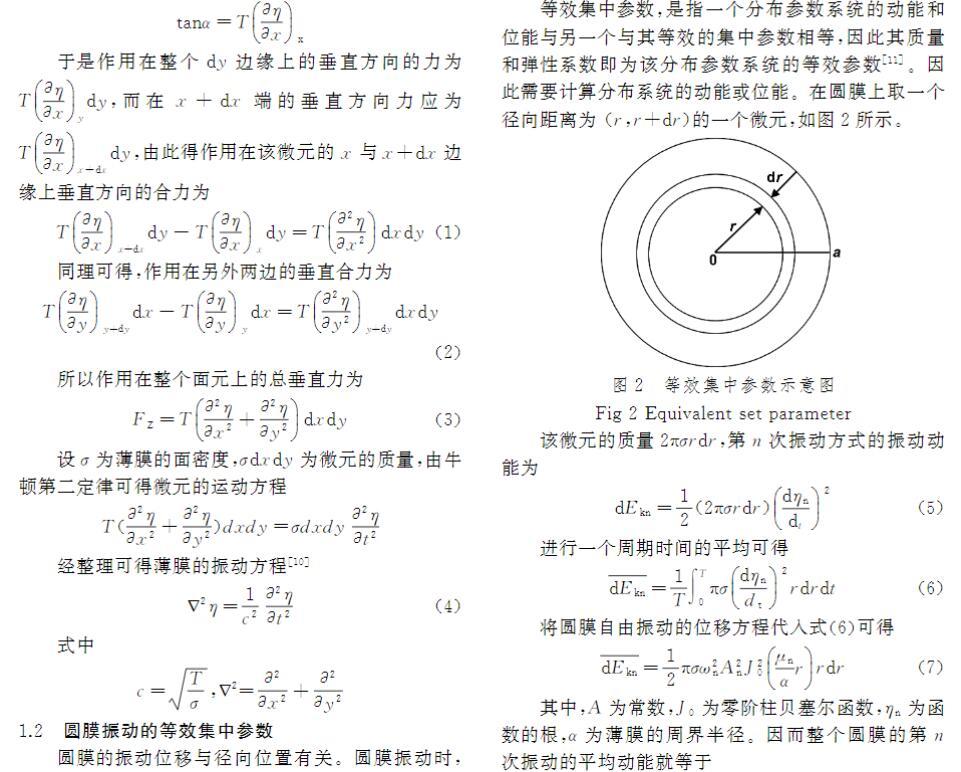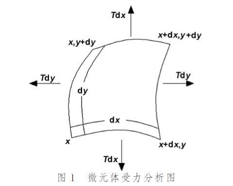 分析薄膜振動(dòng)需進(jìn)行受力分析。薄膜所受內(nèi)力僅為張力。設(shè)單位長(zhǎng)度薄膜張力為T(N/m),單位面積質(zhì)量為ρ。取薄膜平衡位置在xy平面內(nèi)的微元體分析(圖1),當(dāng)其受到垂直xy面的外力擾動(dòng)后,會(huì)在張力T作用下產(chǎn)生橫向振動(dòng),恢復(fù)力主要為張力。