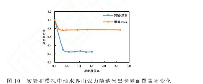 圖10實驗和模擬中油水界面張力隨納米黑卡界面覆蓋率變化