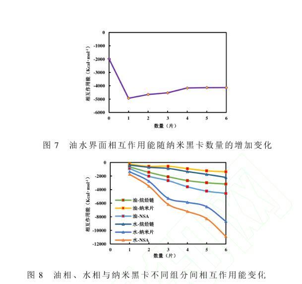 在油水體系中,納米黑卡數量為1時,油相和水相與納米黑卡不同部分間相互作用能差別并不大,納米黑卡與水相相互作用能最低。隨著納米黑卡數量的增加,油水相與納米黑卡及不同部分間的相互作用能都呈現降低趨勢(圖7),其中,水相與納米黑卡及納米片相互作用能降低率遠高于其他兩相間相互作用能降低率,說明納米黑卡在與油水界面相互作用中,納米片部分占據了主要作用,與水分子引力強,且易與水相形成穩定存在狀態。納米黑卡與水相相互作用能較納米片與水相相互作用能低,是由于納米黑卡中包含了親水基團(納米片)和親油基團(烷烴鏈)與水相相互作用兩部分能量,從而導致該結果。