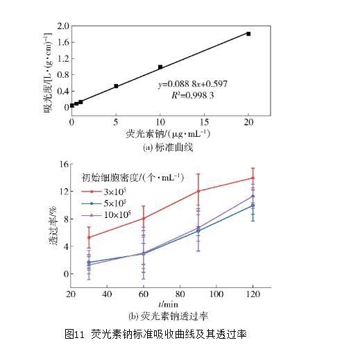 標(biāo)記物跨膜通量的測(cè)定也可以反映單層細(xì)胞膜的完整性,熒光素鈉標(biāo)準(zhǔn)吸收曲線及其在不同時(shí)間段的透過(guò)率見圖11。由圖11(a)的熒光素鈉的標(biāo)準(zhǔn)曲線方程中,代入BL側(cè)的吸光度,可計(jì)算出BL側(cè)的熒光素鈉質(zhì)量,根據(jù)式(4),即可得出不同時(shí)間段的熒光素鈉透過(guò)率[圖11(b)]。由圖11(b)可知,孵育2 h后,3個(gè)不同初始密度的細(xì)胞模型均對(duì)熒光素鈉具有一定的透過(guò)性。初始細(xì)胞密度為3×105個(gè)/mL的細(xì)胞模型對(duì)熒光素鈉的透過(guò)率相對(duì)較高,達(dá)到13.96%;初始AP側(cè)加入熒光素鈉的密度為20μg/mL,最終3種模型的熒光素鈉透過(guò)量均小于0.011 6μg/min,說(shuō)明3種細(xì)胞模型單層膜的致密性能良好。