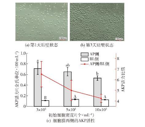 Caco-2細(xì)胞培養(yǎng)狀態(tài)及培養(yǎng)21 d后的堿性磷酸酶活性見圖10。由圖10(a)、(b)可以發(fā)現(xiàn),培養(yǎng)3 d過(guò)程中,單層Caco-2細(xì)胞生長(zhǎng)穩(wěn)定并均勻分布在Transwell上,貼壁情況良好。堿性磷酸酶AKP是小腸刷狀緣細(xì)胞的標(biāo)志酶,其濃度代表了單層Caco-2細(xì)胞的極化和功能。觀察圖10(c)可知,培養(yǎng)21 d后,不同接種細(xì)胞密度在AP側(cè)的酶活性均高于BL側(cè)的酶活性,屬正常的細(xì)胞極化結(jié)果。初始密度為3×105個(gè)/mL的細(xì)胞AP側(cè)的AKP活性高于其他兩組,其BL側(cè)的AKP活性低于其他兩組,證明該組細(xì)胞分化情況較好。隨著細(xì)胞密度的增大,AP側(cè)與BP側(cè)活力的比值呈下降趨勢(shì),說(shuō)明初始細(xì)胞密度過(guò)大不利于細(xì)胞的分化。實(shí)驗(yàn)結(jié)果表明,3種模型細(xì)胞均生長(zhǎng)良好。