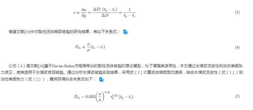 公式(4)是文獻基于Navier-Stokes方程推導出的黏性流體破裂的理論模型,為了增強其適用性,本文通過水煤漿流變性和動態表面張力修正,使其適用于水煤漿微觀破裂。通過分析水煤漿破裂實驗結果,采用式(3)計算漿體喉部剪切速率,結合水煤漿流變性(式(1))和動態表面張力(式(2)),最終獲得擬合關系式如下: