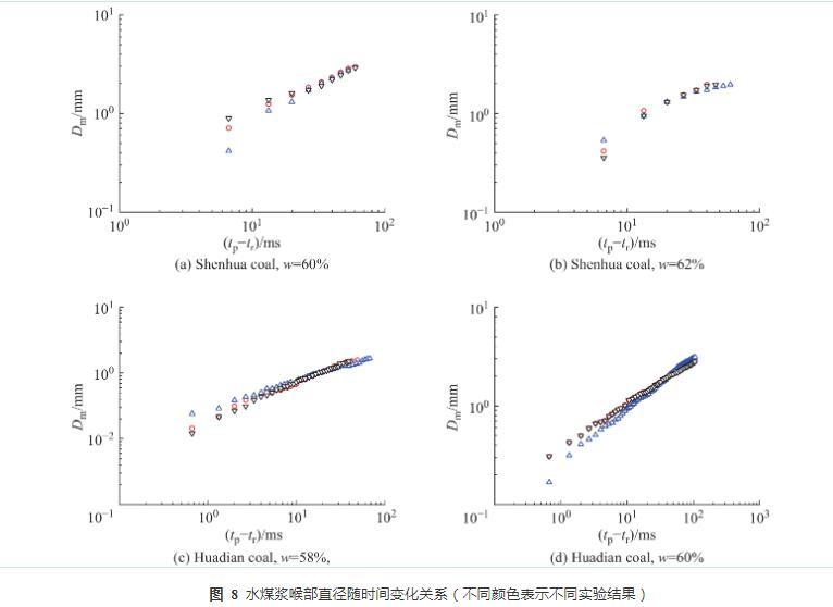 圖8水煤漿喉部直徑隨時間變化關系(不同顏色表示不同實驗結果)