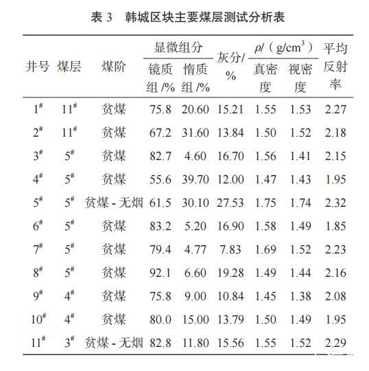 對表3綜合分析可得,韓城主要目的煤層以貧煤和貧煤-無煙煤為主,屬于中高階煤,含氣量較高;相同的演化條件下,惰質組產氣率最低,鏡質組產氣率是惰質組的4.3倍。說明韓城區塊鏡質組的含量相對比較高,含氣量較好,通過合理壓裂改造能獲得較好的產能;各井組的同一層系間差異較大,韓城區塊煤層的非均質性非常強。