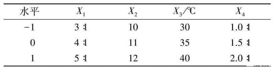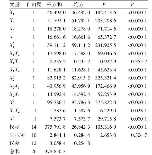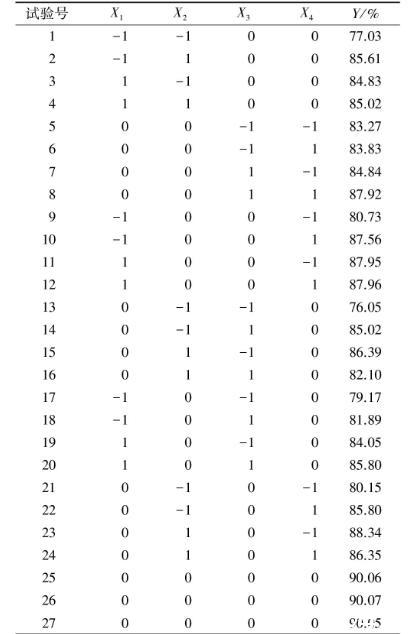 以單因素試驗為基礎,固定反應時間為2 h,以N-椰子油酰基復合氨基酸產率為響應值(Y),復合氨基酸溶液與椰油酰氯體積比(X1)、pH(X2)、反應溫度(X3)、丙酮與復合氨基酸溶液體積比(X4)為影響因素,根據(jù)Box-Behnken的試驗設計原理,通過SAS軟件對試驗數(shù)據(jù)進行回歸分析,確定最佳工藝。響應面試驗因素水平見表1,響應面試驗方案及結果見表2,回歸方程方差分析見表3。
