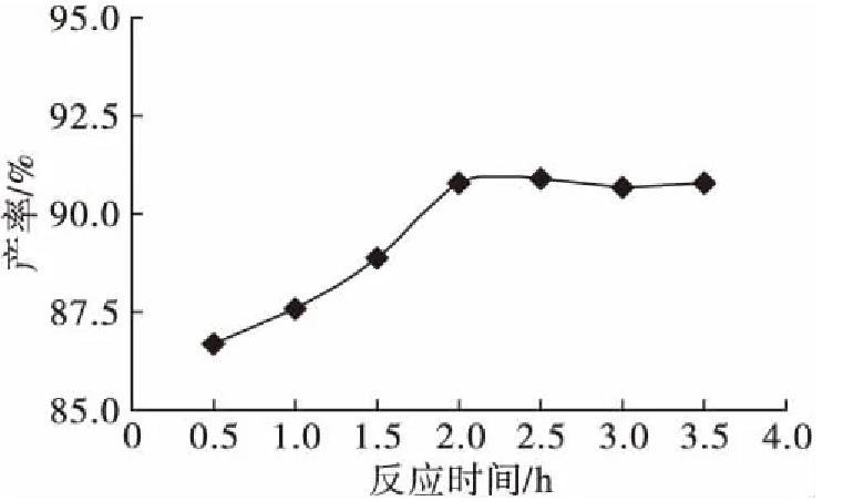 選取復合氨基酸溶液與椰油酰氯體積比4∶1、pH 11、反應溫度35℃、丙酮與復合氨基酸溶液體積比1.5∶1,根據(jù)反應時間對產物產率的影響趨勢,確定最適反應時間,結果見圖4。
