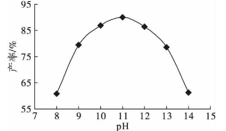 由圖2可以看出,pH影響產率的總體趨勢是首先逐步提高,達到最大值后逐步下降,pH為11時產物產率最大。因此,選擇pH 10~12進行優(yōu)化試驗。
